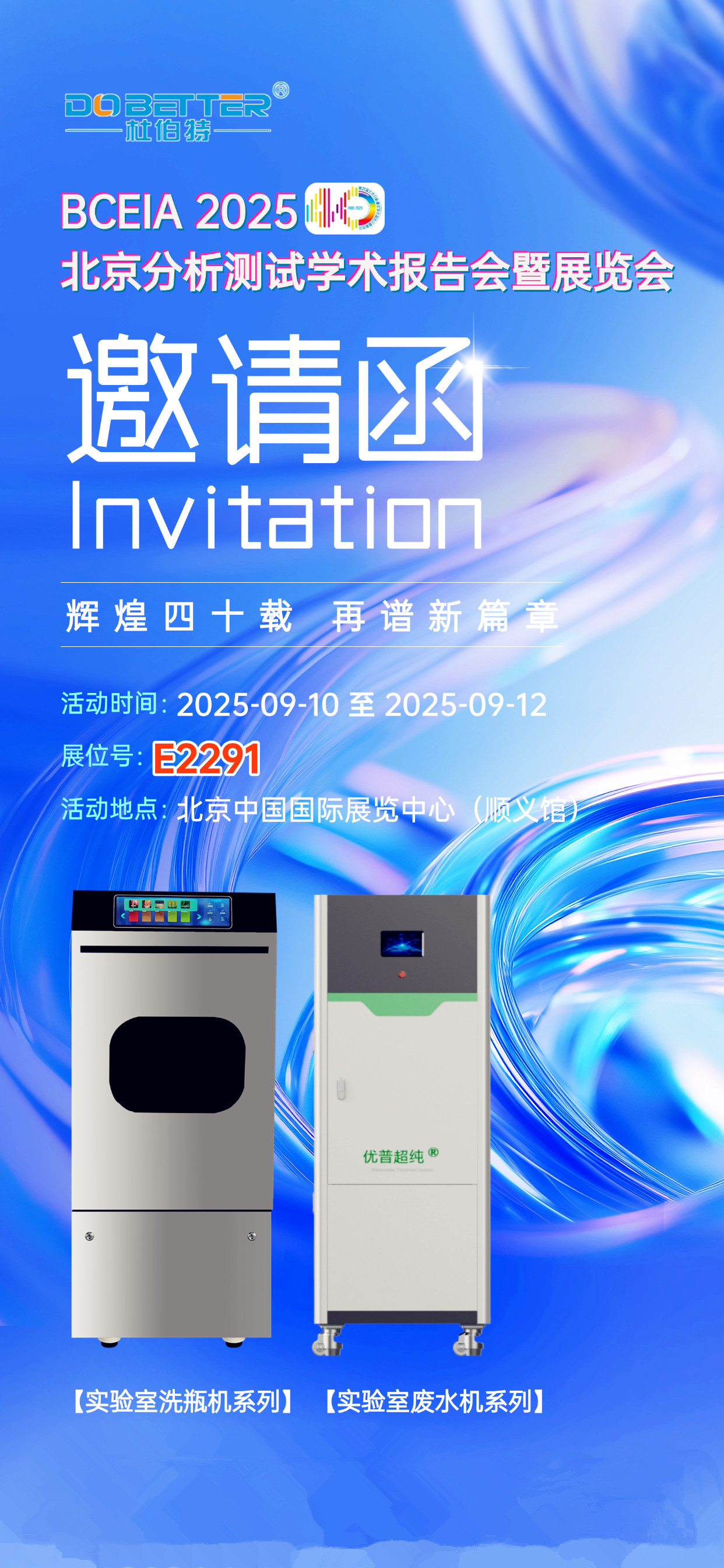 杜伯特誠摯邀請各界同仁蒞臨 E2291 展位。無論是科研工作者尋求清洗解決方案,還是行業(yè)從業(yè)者關(guān)注前沿技術(shù),都能在杜伯特展臺(tái)找到驚喜。讓我們一同沉浸式探索玻璃器皿清洗的前沿科技,解鎖創(chuàng)新應(yīng)用新可能,9 月 10 日,BCEIA 2025,四川杜伯特在 E2291 展位,我們不見不散!