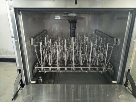 對(duì)于大多數(shù)洗瓶機(jī)都是主要依靠噴淋來沖刷玻璃器皿表面的污物,合理的選擇科學(xué)的沖刷方式將事半功倍。而旋轉(zhuǎn)噴淋也是不可缺少的,杜伯特實(shí)驗(yàn)室洗瓶機(jī)采用360度旋轉(zhuǎn)噴淋,搭配多種不同的清洗籃架,可對(duì)玻璃器皿內(nèi)外表面進(jìn)行無死角的清洗,保證器皿清洗潔凈度。